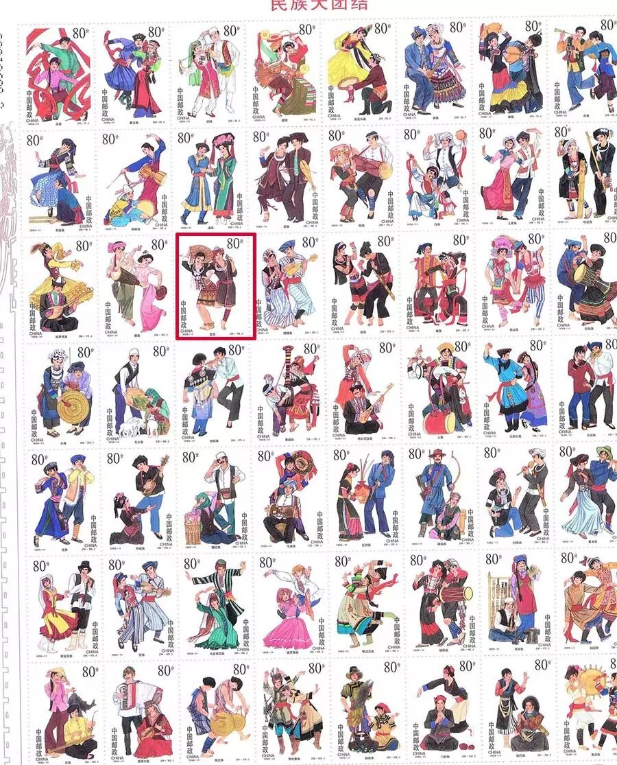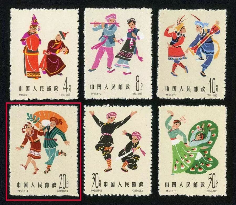 特55《中国民间舞蹈(第三组)》中,一枚邮票上一对身着黎族服装的青年男女翩翩起舞的画面,表达了黎族群众过“三月三”的喜庆。