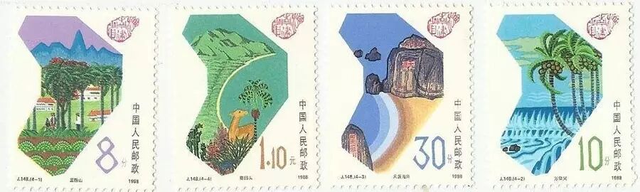1988年4月20日发行的J148《海南建省》分别以“五指山”“万泉河”“天涯海角”“鹿回头”四个画面,展示了海南最有代表性的四处美景。