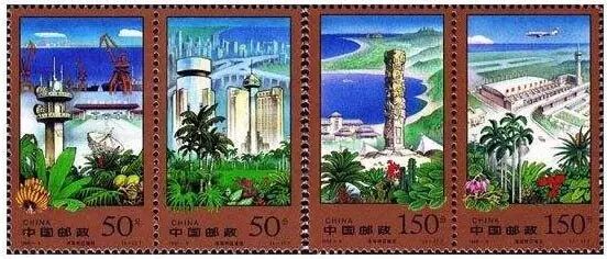 1998-9 《海南特区建设》特种邮票,分别表现了海口城市建设、洋浦经济开发区、三亚凤凰国际机场、亚龙湾国家旅游度假区的风采。