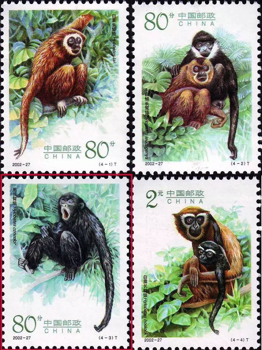 2002-27 《长臂猿》特种邮票,展示了海南长臂猿。
