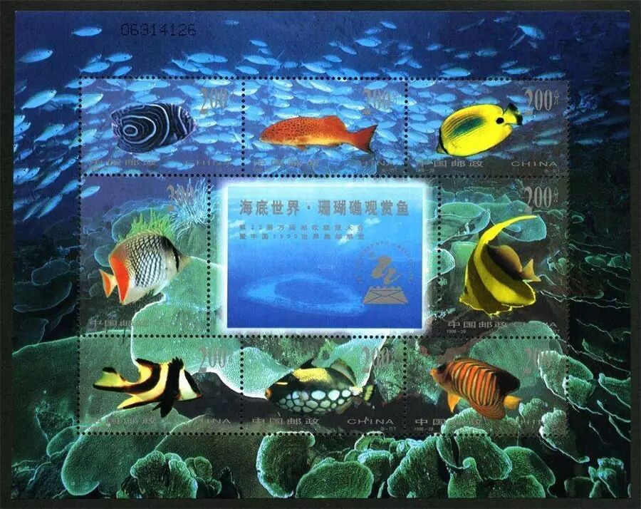 1998年12月22日发行的《海底世界—珊瑚礁观赏鱼》,邮票上的观赏鱼,在我们海南的大部分珊瑚礁丛中生长着,它是让到海南的潜海旅游者梦寐以求的。