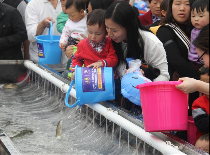 家长们早早的带着小朋友来到了鱼苗放生现场