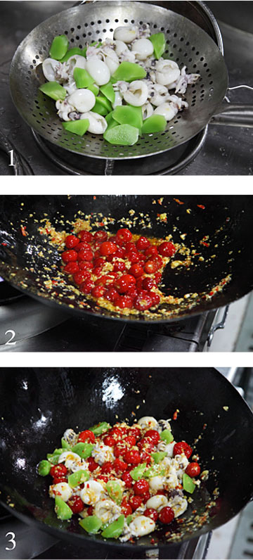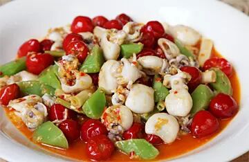 此菜加入了子弹头红泡椒,寓意红红火火,吉祥如意。虽然泡椒墨鱼仔在酒楼饭店已经流行多年,但是既好看又好吃,还是很适合在节日宴席上出现。