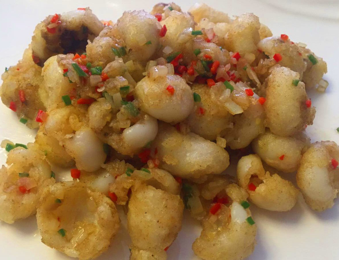 2.锅中做油,逐个下入墨鱼仔,炸酥捞出;另起干净锅,煸入青红椒粒,撒上花椒面、盐、倒入炸好的墨鱼仔,翻炒均匀,出锅装盘。