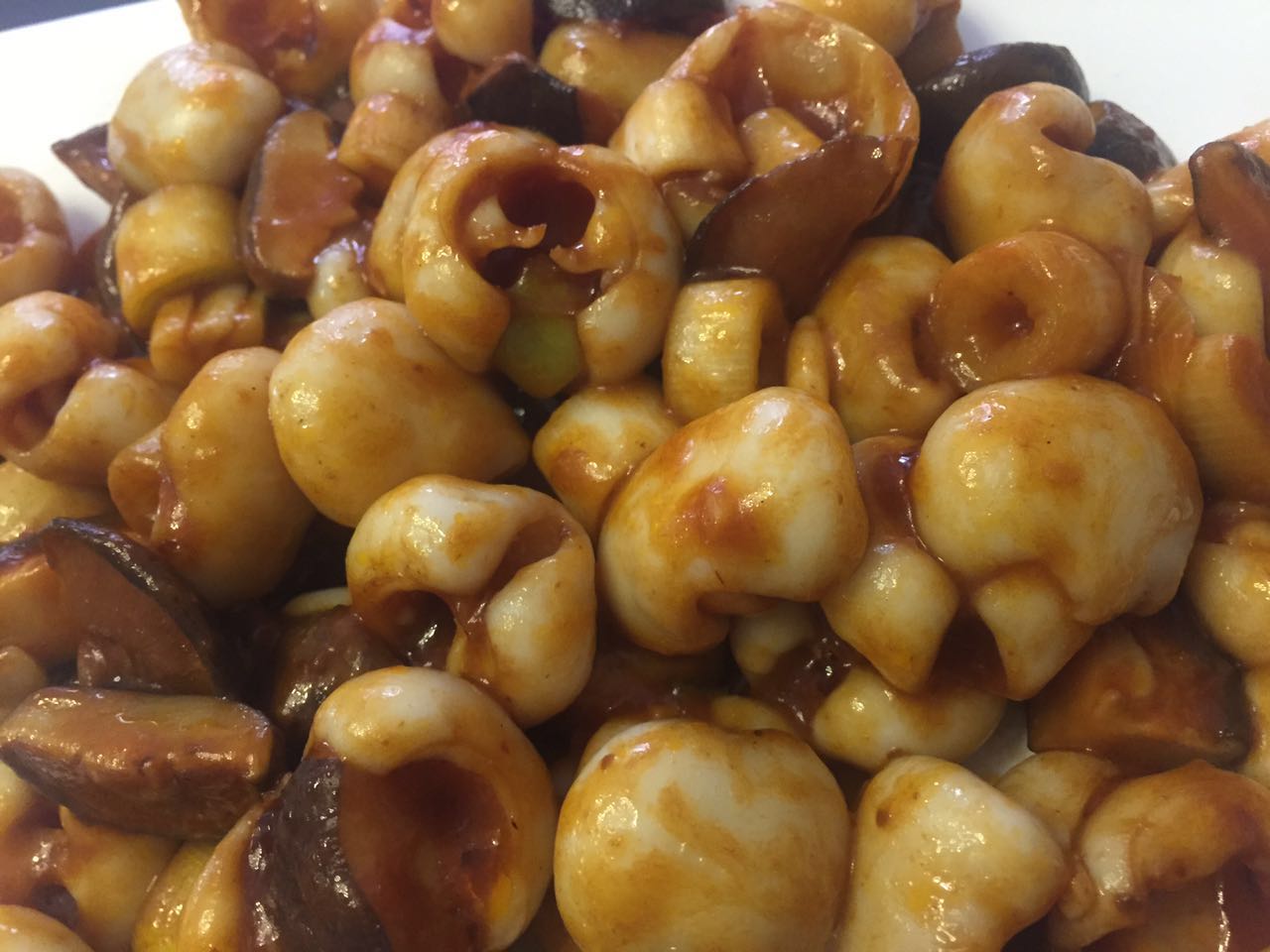 2.锅中做少许香油,煸炒姜末爆香后,加入葱丁、蒜片、下入甜面酱、番茄酱继续煸炒,烹入料酒,调入盐、味精、糖后,加入焯好的墨鱼仔、香菇和笋片用水淀粉勾芡,酱汁均匀裹在菜品上,出锅装盘。