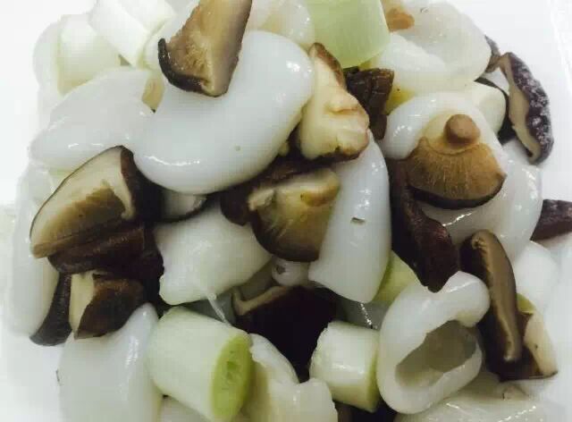 1.墨鱼仔自然解冻后,清洗干净后焯水,然后再把香菇和笋片一同焯水倒入漏勺控干水分;