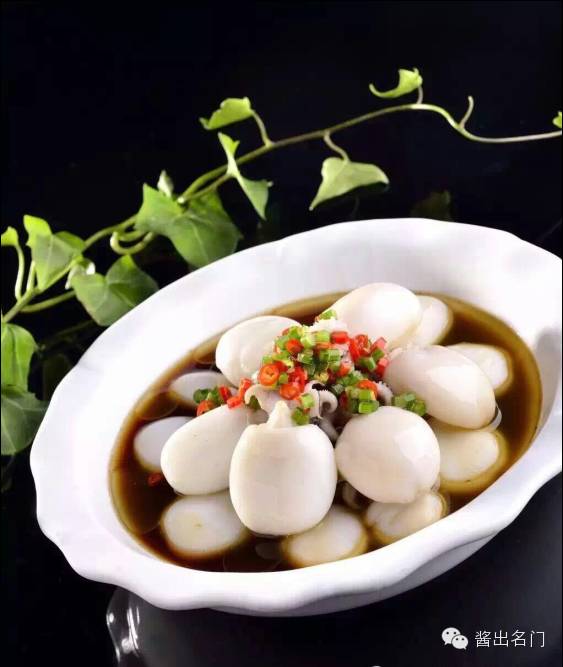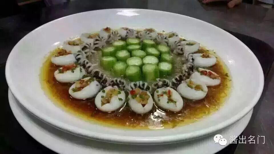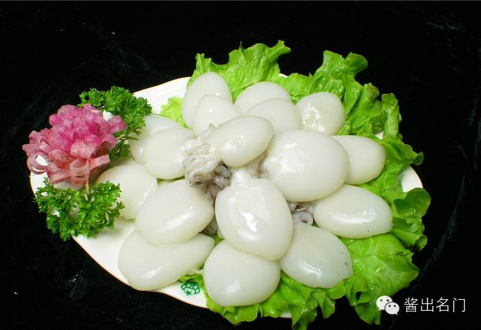 2、取一圆盘将墨鱼仔平放在盘中,在将以上各调料拌匀后放在墨鱼仔上,入笼锅中蒸约3分钟取出,撒葱花淋上热油配雪饼上桌即成。