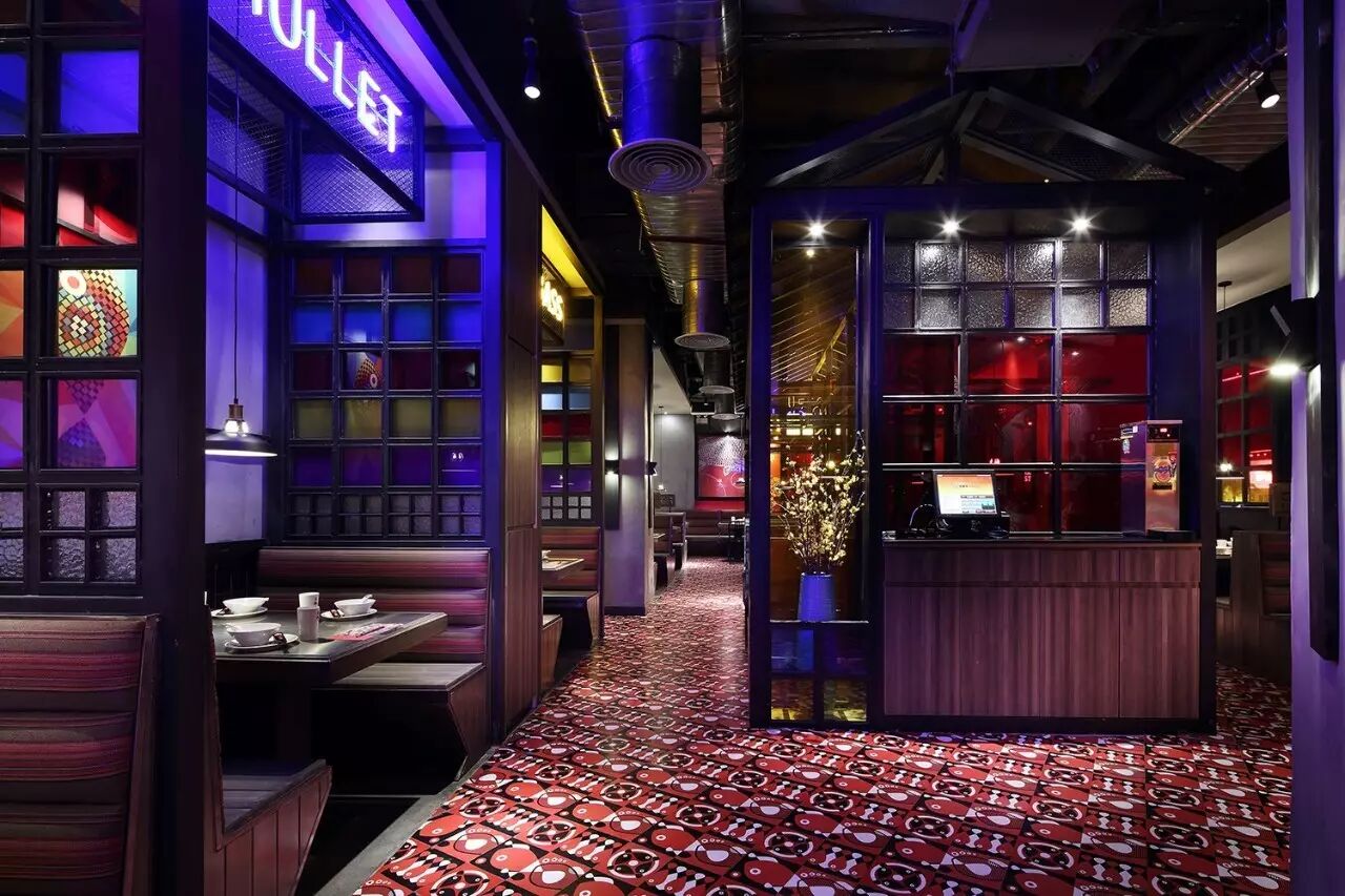 传统中国红元素与黑色铁艺工业风元素平分秋色,