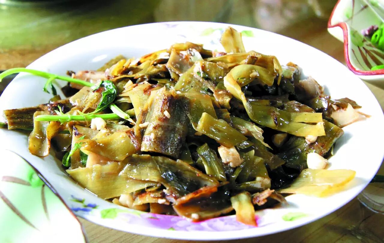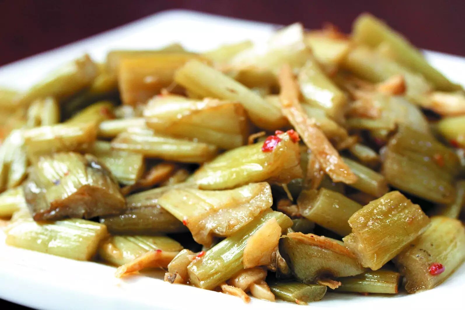 为何名中有“荷”字?其实芋荷跟荷花没有关联,只是因为“芋荷”的叶子长得与荷叶相像,则取其“荷”字。“芋荷”本身就有咸味,吃下去爽脆又带些许黏滑,有少许酸味。芋荷比酸菜的口感稍微厚重、饱满,清炒食用,十分下饭。