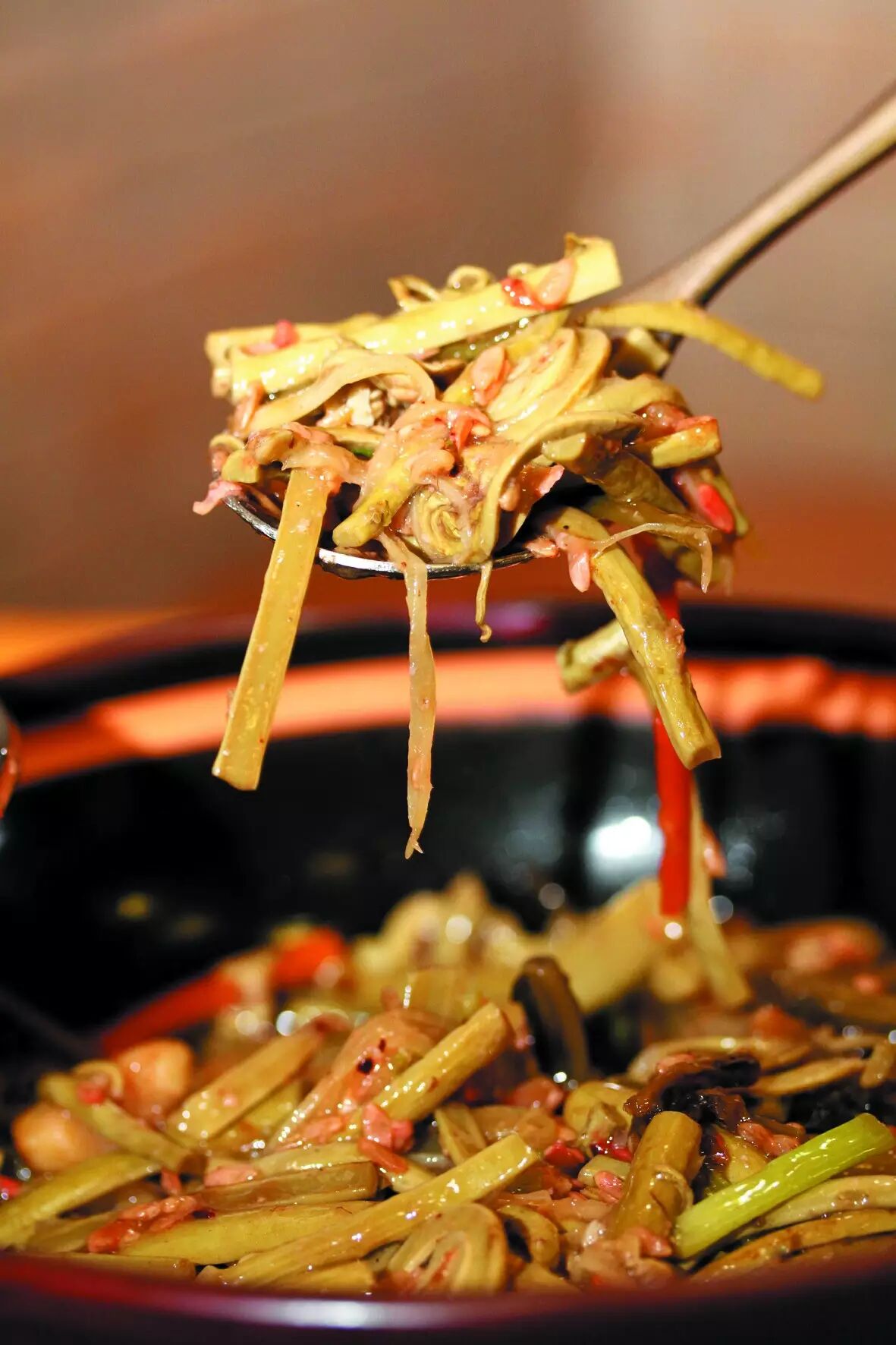 这道菜由咸菜条、山蕨菜条、辣椒丝炒成。出色的亮点就在于山蕨菜的加入,山蕨菜有种滑溜黏糊的特殊口感,和咸菜的咸香脆爽、辣椒辣味混合起来,加上客家人特别喜欢用的酒糟作为调味,酒香味融入其中,口感层次十分饱满。