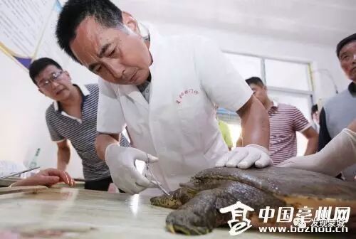 8月25日,蒙城县城,动物门诊的医生准备绘吃到鱼钩的甲鱼进行救治。