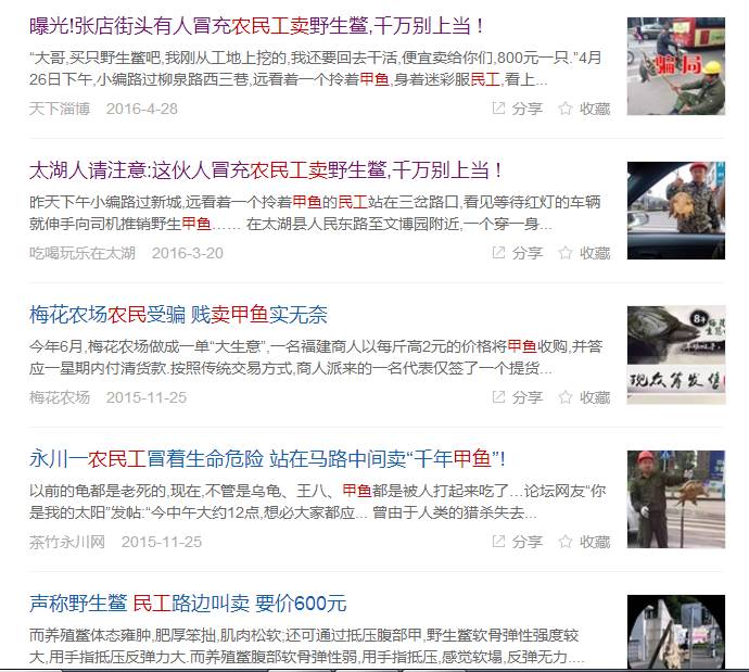 在网上搜索一下,不难发现,最近几年经常有这样的新闻出现,无非就是拿一些生长速度比较快的大型外来龟鳖品种来冒充野生龟鳖行骗。广大市民还是要提高警惕,避免上当受骗!
