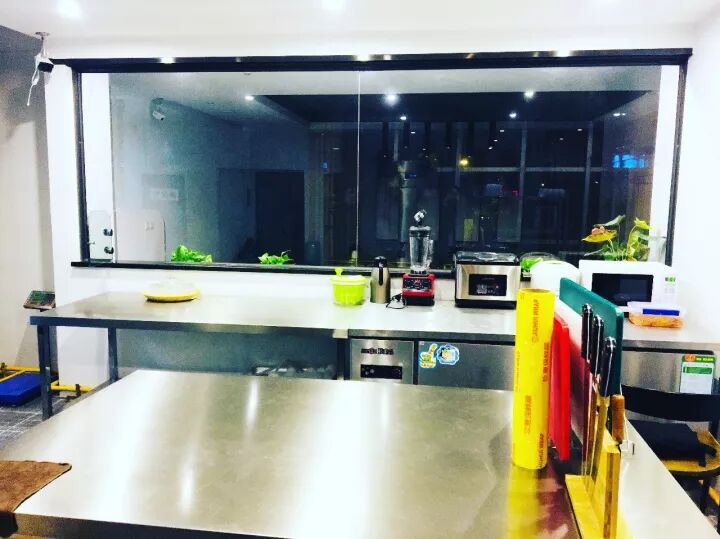 她们家厨房是这样式的,透明的玻璃窗把厨房一览无遗,随时欢迎检查,特别干净。新鲜的食材也是随意的放在盆子里,原生态的hin。