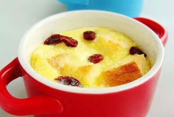 ❺ 把吐司放入烤碗中,加入过滤好的布丁液,9分满就可以,撒上葡萄干或曼越莓干;