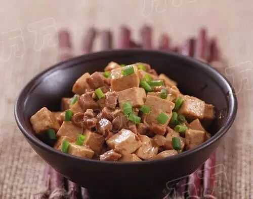❶豆腐切1cm见方的块,瘦肉切丁。锅里热油,葱姜爆香后放入肉丁。