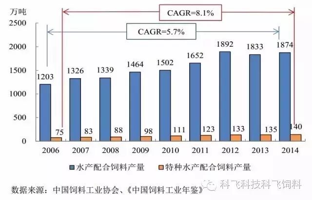 特种水产养殖业的兴起,不仅在调整渔业产业结构方面发挥了重要作用,同时也推动了特种水产配合饲料市场蓬勃发展。根据中国饲料工业协会的数据,目前全国涉及特种水产配合饲料产品生产的企业约有600多家,其中以特种水产配合饲料作为主营业务的不足三成,年产3万吨以上特种水产配合饲料的企业不足25家。根据中国饲料工业协会提供的数据,我国特种水产配合饲料产量从2006年的75.24万吨增长至2014年的140.22万吨,年均增幅超过8%,高于水产配合饲料行业同期5.7%的平均增速。