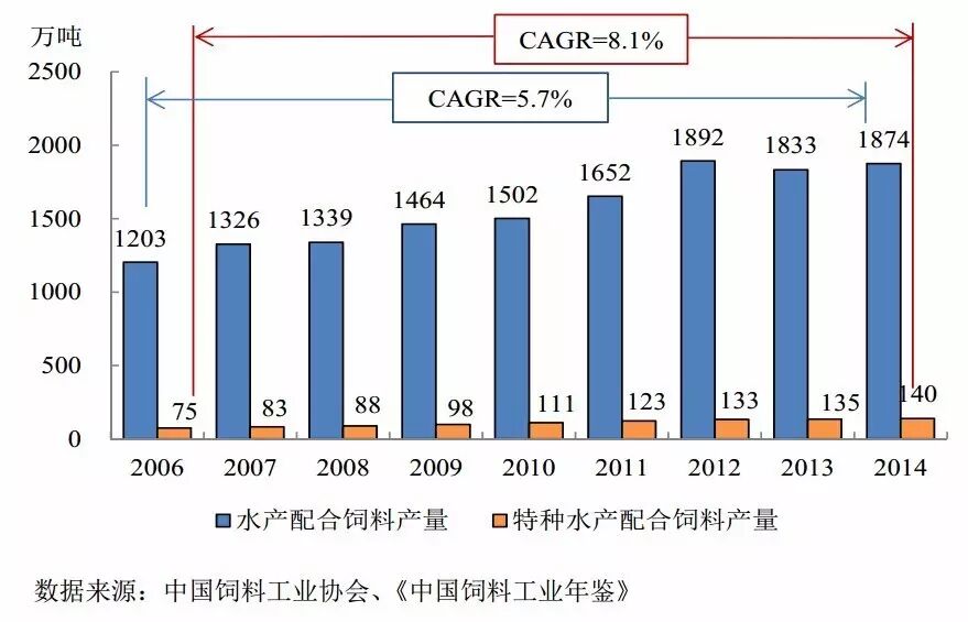 特种水产配合饲料产量从2006年的75.24万吨增长至2014年的140.22万吨,年均增幅超过8%![]()