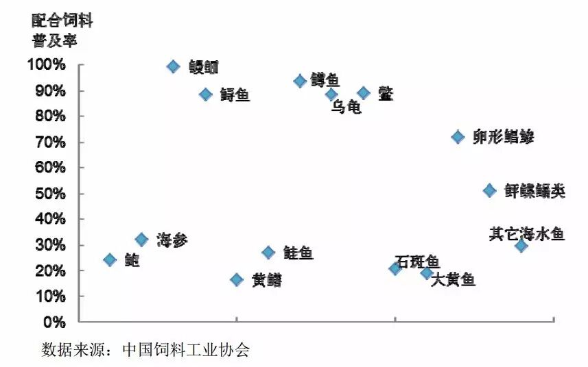 特种水产养殖动物食性基本为肉食性或偏肉食性,传统的养殖方式主要采取投喂冰鲜杂鱼。根据中国饲料工业协会提供的数据,目前养殖的主要特种水产动物中,鳗鲡、鳖、鲟鱼、鲑鳟等淡水品种饲料普及率较高,但海水鱼配合饲料普及率仍较低,石斑鱼、大黄鱼等海水鱼配合饲料普及率仅在20%左右。