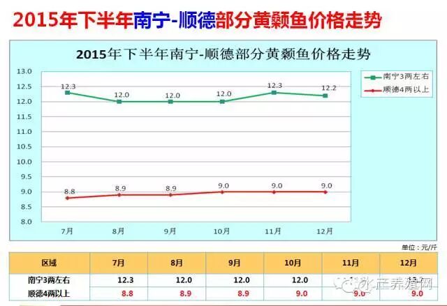 3、2015年下半年南宁地区3两的黄颡鱼价格均在12元以上,7月、11月价格达到最高,为12.3元/斤,8-10月价格最低,为12.0元/斤,波幅为0.3;