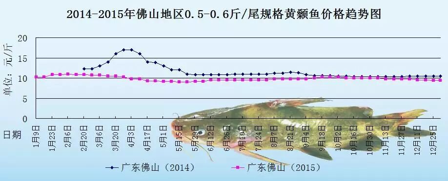 中国水产频道原创报道,下图是2014年、2015年广东佛山地区0.5-0.6斤/尾规格黄颡鱼的价格趋势图,由图中可以看出,年后黄颡鱼的市场销售进入消费淡季,鱼价不断下滑,所以2015年3月份至8月中旬的鱼价与2014年同期相比相差了2-7元/斤,价格差异非常明显。