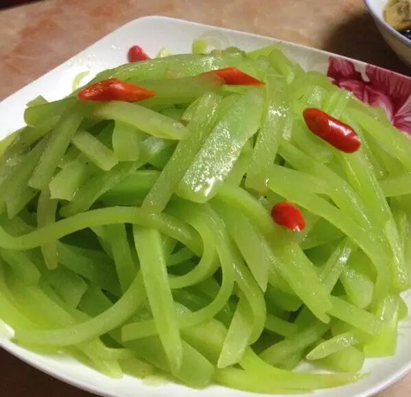 用料:莴笋1根、新鲜红椒1颗,装饰用、盐1/4小匙、鸡精1/4小匙
