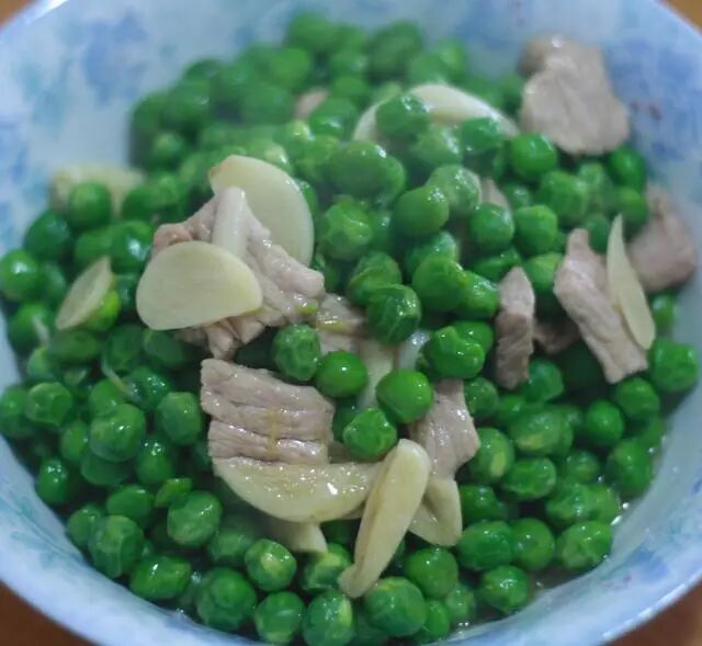 用料: 青豆、耗油、肉、蒜、少量生抽、盐