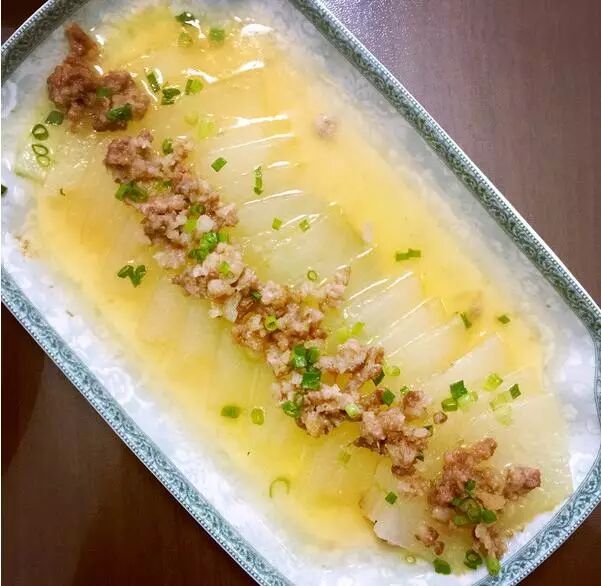 4.将冬瓜片放入盘中铺平,将腌好的肉末铺在冬瓜上,放入蒸锅里,用中火蒸8分钟至冬瓜熟透,出锅滴上几滴香油,撒上葱花即可