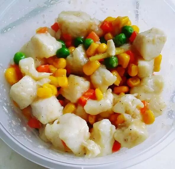 用料: 龙利鱼一条、青豆一把、玉米粒一把、胡萝卜丁一把、料酒一勺(腌鱼)、盐一小勺(腌鱼)、五香粉一小勺(勾芡汁儿)、白胡椒粉一小勺(勾芡汁儿)(炒素菜的盐再少点 试试)、盐小半勺(勾芡汁儿)、淀粉一大勺(勾芡汁儿)、葱姜炝锅(感觉可省)、小葱末最后装饰(也可省)