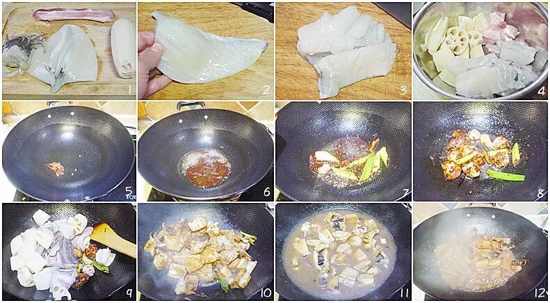 9、加入莲藕与墨鱼块翻炒;