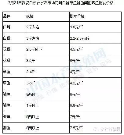 淡水鱼价格方面,最近一段时间虽然淡水鱼价格没有出现明显下滑的情况,但是整体疲软的局面依然维持,跌幅最大的就是花鲢鱼。具体来说,2斤左右白鲢批发价格是1.6元/斤,3斤左右白鲢批发价格是2.2-2.3元/斤,2.5斤以下花鲢批发价格是4.5元/斤,3.5斤花鲢批发价格是6元/斤,2-4斤草鱼批发价格是4元/斤,3-5斤草鱼批发价格是4.2元/斤,8两以上鳊鱼批发价格是6元/斤,1斤以上鳊鱼批发价格是6.8元/斤,5两以上鲫鱼批发价格是7元/斤,8两以上鲫鱼批发价格是7.5元/斤,花鲢鱼价格最近一周平均下滑了至少五毛钱一斤,草鱼价格也是跌一点张一点,涨跌幅度不大,最近华中地区行情好点的品种应该就是鲫鱼了,一方面是夏季鲫鱼价格习惯性上涨,另一方面,近期华东地区腮出血病导致好鱼数量减少鱼价上涨,华中地区鲫鱼价格因此获益。
