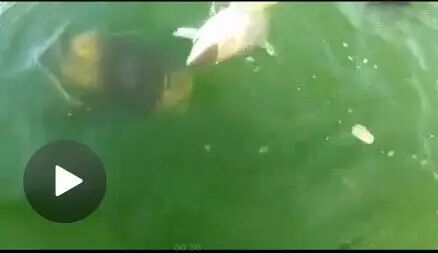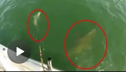 鲨鱼被钓了上来,在它左边潜伏的石斑鱼也已经蠢蠢欲动