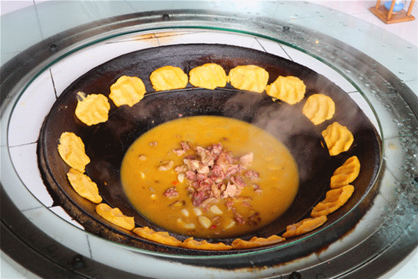 揭开锅盖,偌大的铁锅里,浏阳纯种土鸡正炖的咕嘎作响,金黄灿灿的色泽让人垂涎三尺,锅沿四周还“挂”上满满一圈的玉米饼。据介绍,厨师在烧热的铁锅中放入茶油和菜籽油,爆香姜蒜后倒进鸡块翻炒仅加盐和少许白酒调味,最后加入熬好的母鸡汤焖煮45分钟。待到快熟时,服务员会麻利地在锅边贴一圈玉米饼,一会便能开动了。这种最原始的农家本味做法,既给都市人视觉上的新颖感,又给久已麻木的味蕾带来鲜爽的刺激。