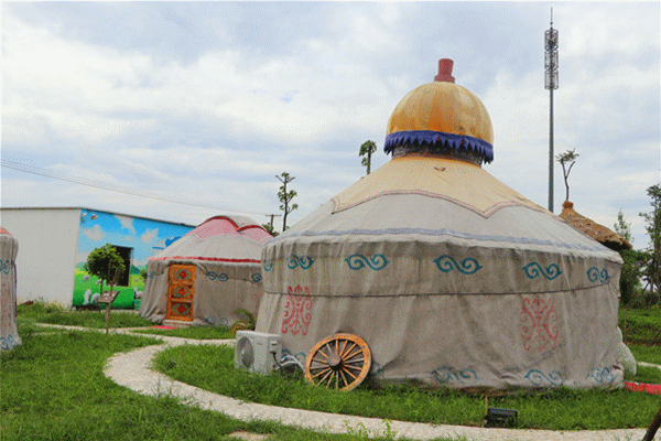 院子里一共有5个设备齐全的大型蒙古包,每一间都以科尔沁之类的内蒙古地名命名,蒙古包外的云纹图案、室内的羊头挂件,以及成吉思汗和狼图腾的挂画,都散发出浓浓的草原风情,让人瞬间穿越到“风吹草低见牛羊”的茫茫大草原。