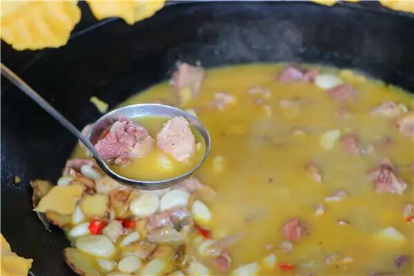 别急,这锅土鸡的正确打开方式是,抿一口、嚼一嚼、泡一泡,再整锅端掉。先盛一碗带肉的鸡汤,浅尝一口,让鸡汤的鲜美激活味蕾,再尝尝鸡肉,香而微辣的鸡肉肉质紧实弹嫩,鸡皮Q弹柔滑,蘸上汤汁更是“鲜”气直冒。接下来,添上半碗米饭泡在鸡汤里,三碗不过岗。最后,别忘了锅边的美味——玉米饼,借着柴火锅温烘烤出的玉米饼香甜可口,贴在锅壁的一面微脆焦香,另一面则软糯清甜,吃完原味再蘸上微辣鲜美的鸡汤,又别有一番韵味。