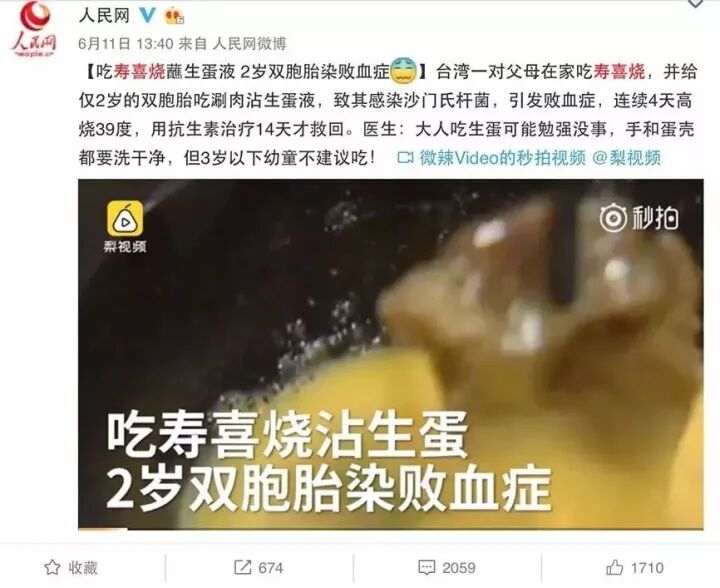 当时这家人在家吃寿喜烧(日式火锅),粗心的父母将沾了生蛋液的涮肉给宝宝吃,致其两个宝宝感染沙门氏菌,引发败血症。