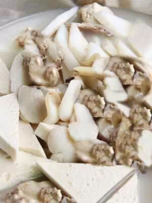 4、加入香菇片、葱段、姜片煮沸,改用小火炖约40分钟;