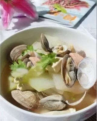 4、锅置火上,加入高汤烧沸,先下入冬瓜蓉、虾仁、鲜贝、芥蓝片略煮。