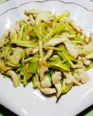 5、再加入鸡脯肉丝炒至变色,放韭黄段翻炒至熟,出锅前加食盐、胡椒粉调味即可。