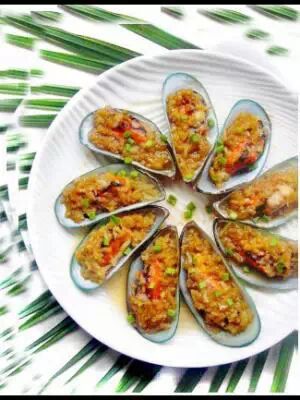2、把青口贝外壳刷洗干净;蒜瓣去皮,剁成蒜蓉。