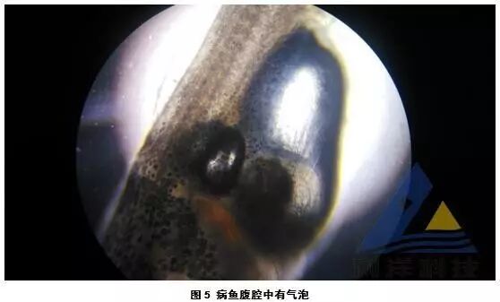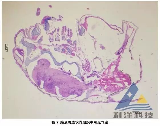 4月28日,晴天。全天停电,未开增氧机。中午13:00巡塘时鱼苗情况正常。下午17:45发现池塘水色浓绿(图1),水体中不断有小气泡逸出,水中树叶表面附着大量气泡(图2)。大量鱼苗翻肚且狂躁不安的游动、打转、弓身,有冲撞器皿或小船现象,继而靠边或死亡(图3)。病鱼腹部胀气(图4、5),部分胃部有食物,规格约1cm/尾。检测水质指标:氨氮无、亚硝酸盐0.05mg/L、pH值9.5、溶氧“爆表”(图6)、水温25.5℃。组织病理切片检测显示:脑及周边软骨、鳃、肝组织中均可见气泡,脑中气泡周边组织细胞发生核固缩,鳃中气泡导致鳃上皮肿胀(图7、8、9)。