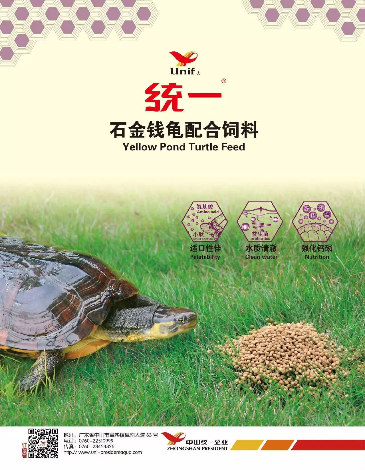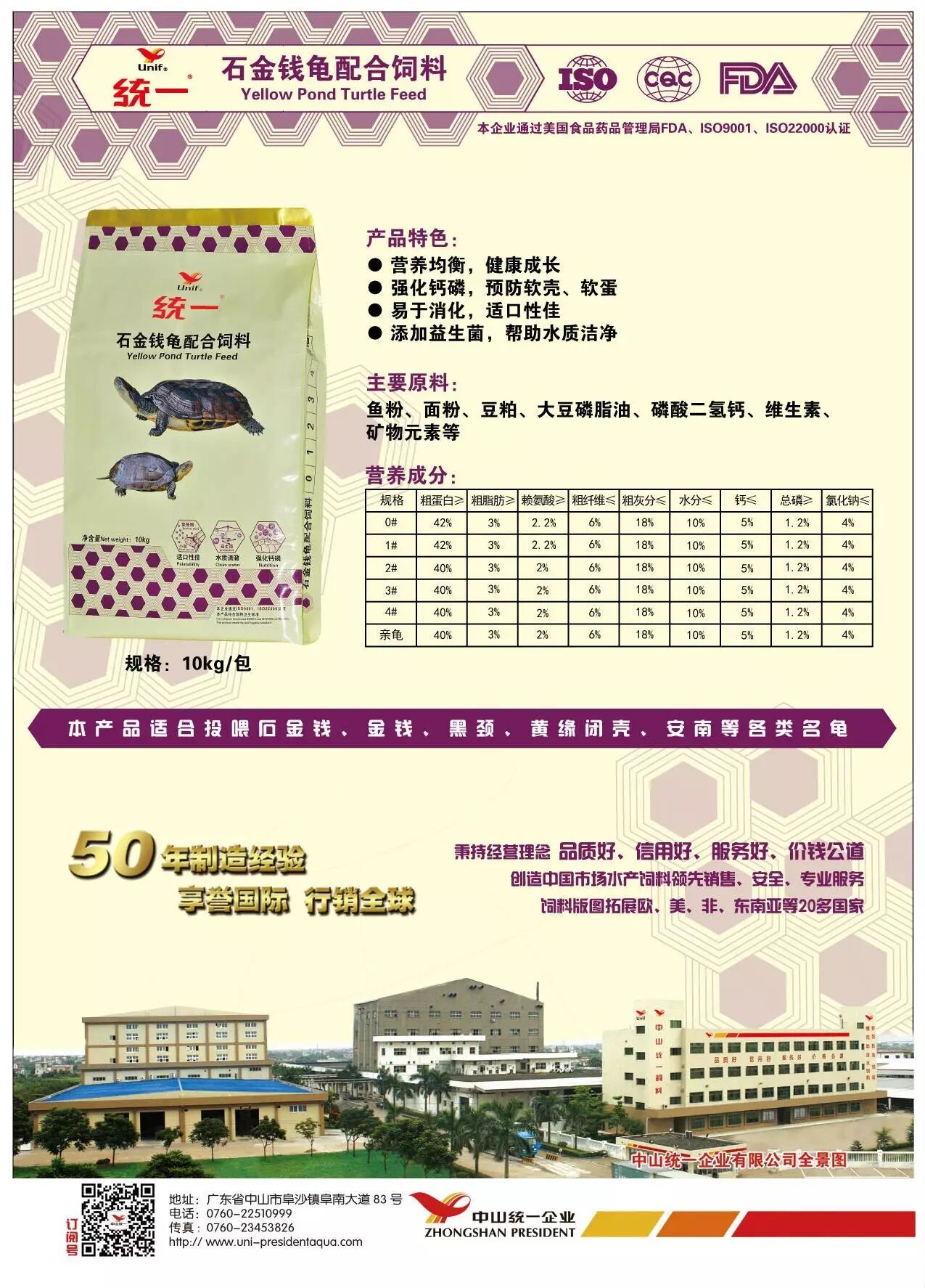 统一石金钱龟饲料由中山统一企业有限公司专业团队研发,根据石金钱龟生长特性及摄食喜好而定制开发的,使用优质进口鱼粉及各种新鲜的原料作为基础,添加有效益生菌,配方针对钙磷比例进行合理匹配,使我司产品具有良好嗜口性、消化吸收率高、成长速度快、龟壳硬度高、保持水质清澈、让龟更健康。