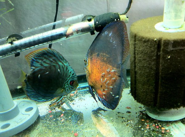 如果说大鱼哺养小鱼的例子,盘丽鱼属(Symphysodon),又叫七彩神仙鱼属,会用分泌物喂小鱼。