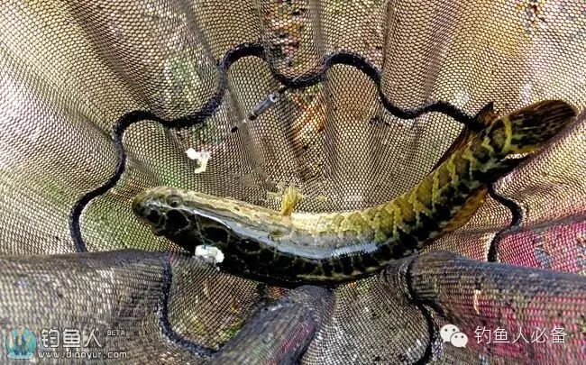 也许是攻击小鱼时误打误撞上的,右手继续上举,左手已将抄网送了出去,小黑鱼在水面连滚带爬地跌入抄网内。