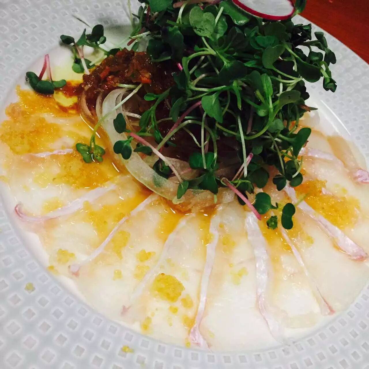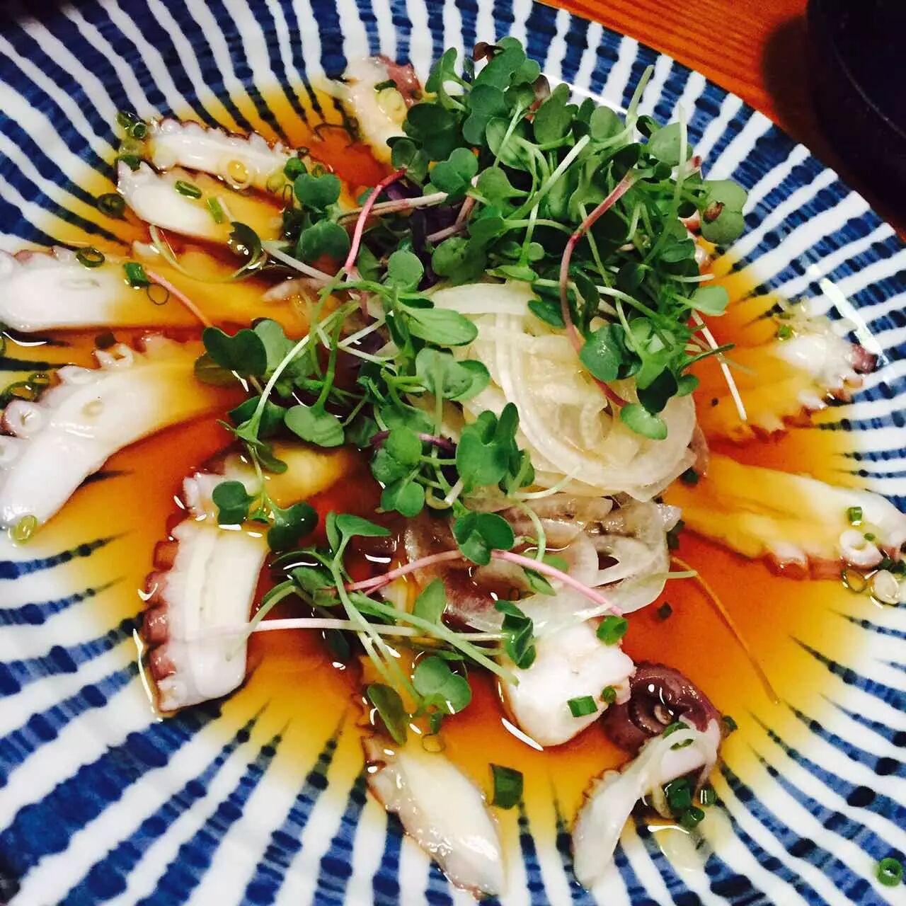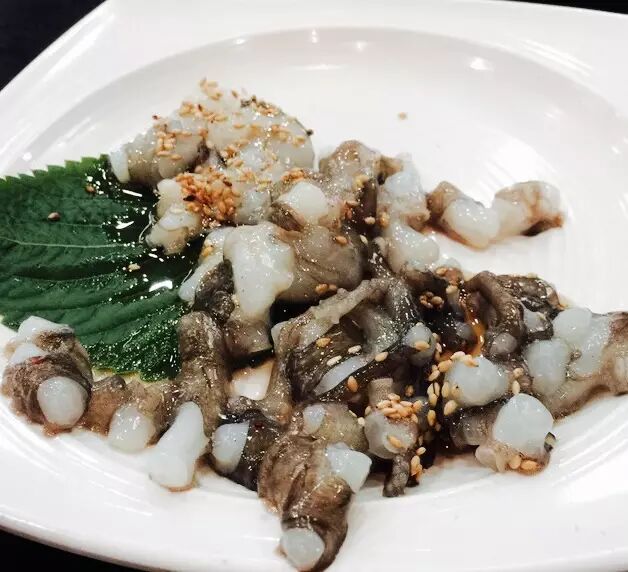 鱿鱼和旁边的什么鱼刺身酸酸的挺爽口,很适合开胃。
