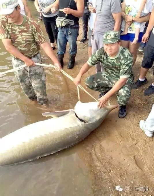 据介绍,21日中午同江市渔民李某、张某在街津口下滩滩地捕鱼作业时意外捕获一条长达220厘米,重达400斤的雄性鲟鳇鱼。由于鲟鳇鱼是濒危物种,所以捕捞后李某立即拨打了报警电话,街津口边防派出所官兵们赶到现场后,帮助渔民把这条鲟鳇鱼妥善安置在了岸边的深水区。