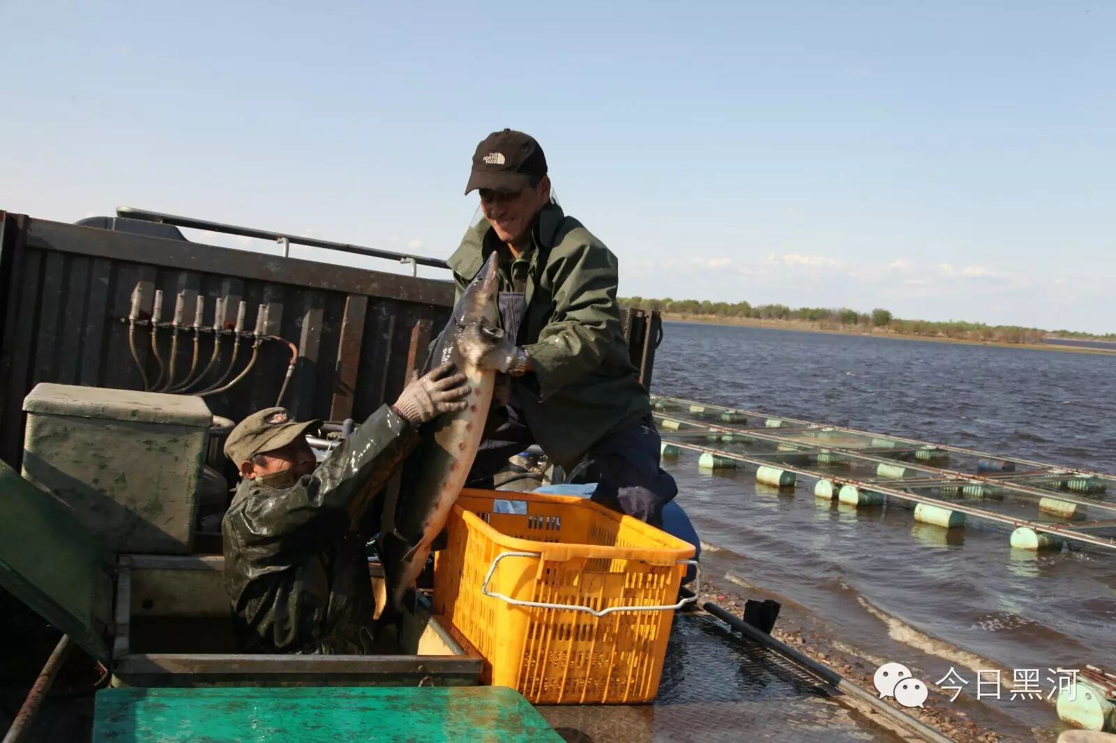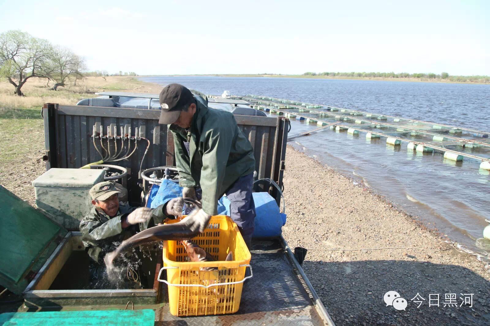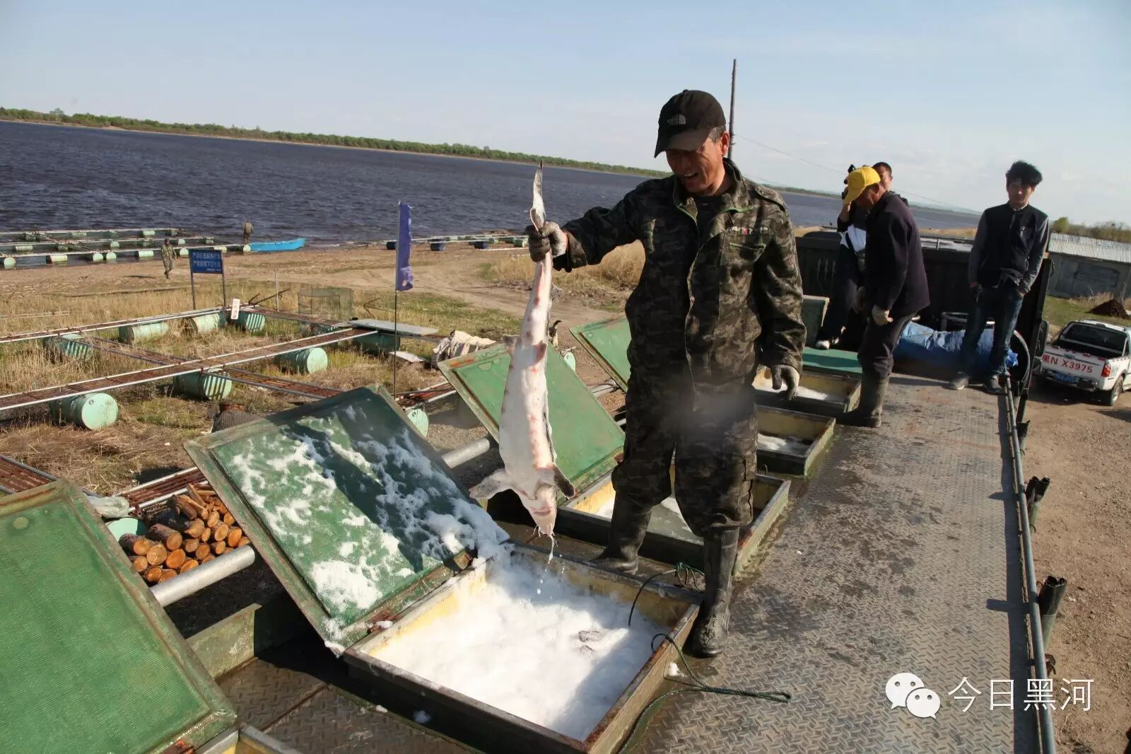 5月18日,从武汉长江水系运输的第一批1.2万斤鲟鳇鱼,顺利抵达黑龙江黑河沿江爱辉区坤河乡黄旗营子村黑河华之宝鲟鱼有限公司网箱养殖基地,开始放养网箱养殖,放养的鲟鳇鱼将在网箱养殖三个月左右后投放市场。