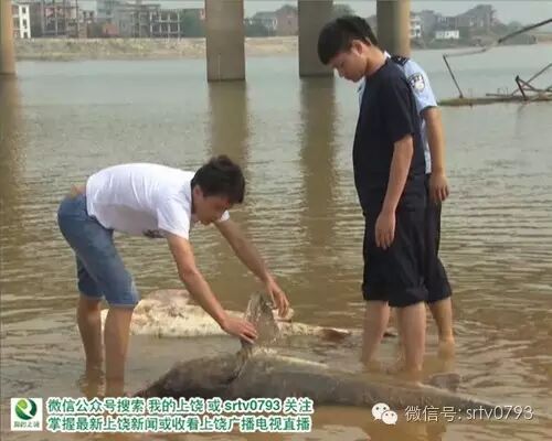 6月28日早上7点左右,鄱阳县渔政局工作人员接到群众电话热线,称在昌江河鄱阳县湖城大桥附近水域,有两条疑是中华鲟的大鱼搁浅在河流浅滩处,已经死亡。