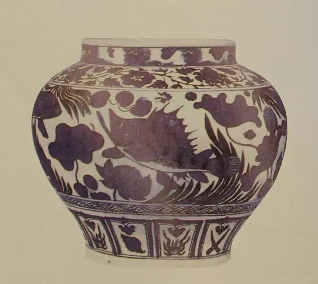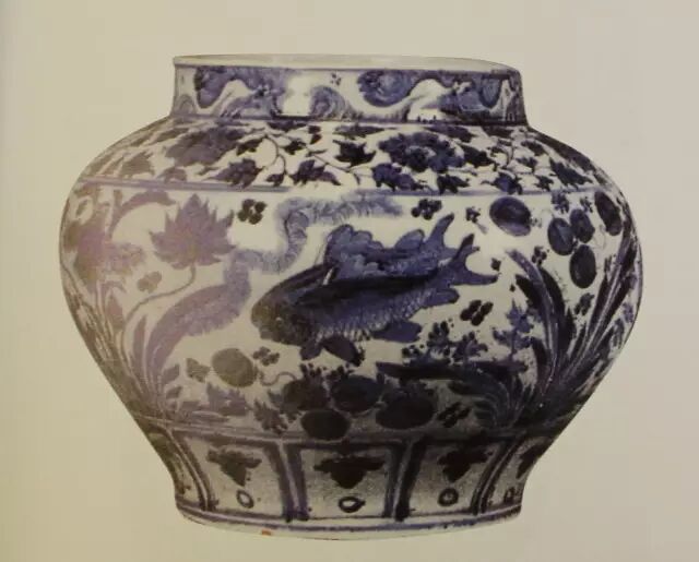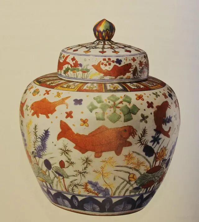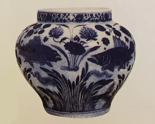 这是一件收藏在日本东京富士美术馆的大罐。两条鲢鱼并肩而行,畅游于水藻莲花之中。鲢鱼是最早被人工驯化的四大鱼种之一,是非常常见的鱼类。