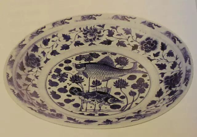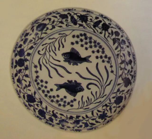 鲳鱼体型短而高,极侧扁,头小、吻短而圆。这件青花牡丹缠枝鲳鱼纹盘收藏于湖南博物馆,一条肥硕的鲳鱼和一条桂鱼分列盘底。