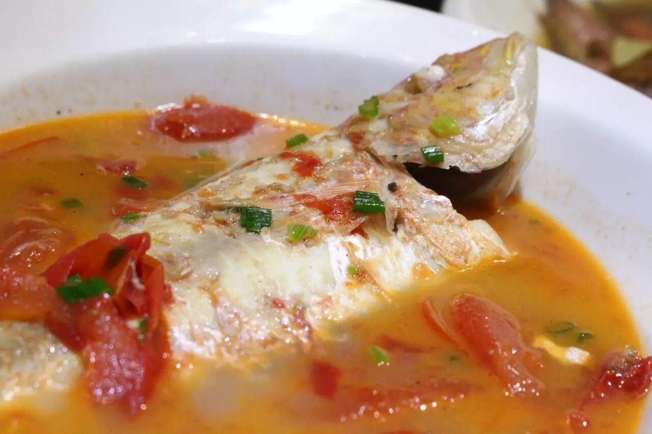 不同于家常红烧做法,选用新鲜上好的潮汕吊鲤用番茄来烧,不放盐和味精,只放鱼露,番茄的酸味反衬出吊鲤清淡的滋味,鱼汤特别好喝,酸甜爽口,鲜味十足。